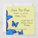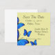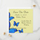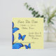 Vackblått och gult Spara datum meddelande kort, med ljusblå fjärilar. Anpassa texten till kostym efter dina behov. Extra-porto krävs för detta storleka kort.