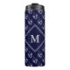 Snyggt midnattsblått och grått RESEMUGG med allt över grått DREIDEL-utskrift mot midnattsblå bakgrund. Det finns ett monogram för anpassadet i mitten, så du kan anpassa dig med ditt eget. Andra versioner finns i HANUKKAH Collection by Berean Designs.