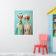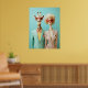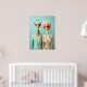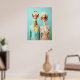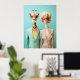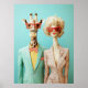 En surrealistisk bild av popkonsten stil med en giraffe och en glamorös kvinna klädd i elegant, vintage-inspirerade konfektioner. Båda bärorna överdimensionerade röda solglasögon, som uteslöt högpatogen mode mot pastellturkos.