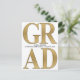 Snyggt och modern inbjudan/meddelande om vit studentfest med guld-bokstäver "GRAD". Baksidan av detta kort har allt du behöver från ditt meddelande till din ceremonininbjudan till studenten, till din gradfestinbjudan.