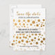 Trendig bröllop spara datum vykort med en gyllene beröring. En snyggt guld dockar mönster med en chic guld-folie konetti ger ett modernt och chic utseende på det speciella bröllop meddelandet..OBS! Punkter i guld glitter återges digitalt och är bara tryckta.