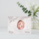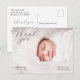 Letar du efter det bästa sättet att tacka dina vänner och familj för deras babyshower-gåvor och deras stöd under din graviditet? Eller vill du tillkännage din nya baby på ett enkelt men elegant sätt? Leta inte mer! Detta vackra eleganta tack-kort har ett helt anpassningsbart foto som blir bakgrund för svart text som visar din information. Meddelandet "tack" är skrivet med en elegant skrivstil och dina detaljer är i en klassisk teckensnitt. Baksidan innehåller din returadress och ett anpassat "tack-meddelande" som du kan redigera eller ta bort. Tryck på knappen "personalisering" för att ersätta bilden och ange din information! Kom ihåg att den bästa bilden för denna design har en ljus bakgrund så att texten blir mer synlig. Om du vill använda ett mörkare foto kan du ändra textens färg till vit via knappen "Redigera ytterligare".