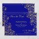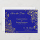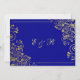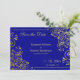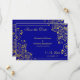 En chic design med falska guldspiraler, blomsterutsmyckningar och små blommor. Mot en klar marinblå bakgrund är detta ett vackert "spara datum"-kort för din bröllopsdag. Den offset-diagonala texten härmar linjerna i det dekorativa sidomönstret. Om du har bestämt dig för blått och guld som dina huvudsakliga bröllopsfärger är detta ett perfekt val.