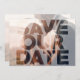 Ditt foto med en SPARA VÅR DATE-övertäckning på framsidan och dina detaljer på baksidan med ett nytt eller samma foto. Använda länken Anpassa ytterligare och använd vårt redigerande verktyg för att göra ändringar. Välj alternativet HD-utskrift om du vill ha bättre fotokvalitet och Matte om du vill ha en tyngre papper.