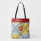 Snyggt Red Vax Monogram Namn-skript Tartan Play Tote Bag Modern, elegant och giftigt anpassade till säcken har "personlig namn" på ett rött rand överst, "personlig monogram" på en röd vax säl under och baby blue/gult plaid tartan bakgrund. Anpassa den här vackra väskan som en underbar gåva till en brud, brud, lärare, vän eller någon medlem av din familj genom att lägga till ditt namn eller text/ändra teckensnitt, färg, storlek och position.