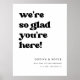 Vi är så glada över att du är här i bröllop välkomstskylt. Ett tema för chic: Använd den här typografiska utformningen av vintage och snyggt för din bröllop-stationär, med ett klassiskt svart-vitt tema. Anpassadet färg och bakgrunder.