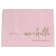 Skriptet Glam Guld Monogram Namn med Rosa Modern Elegant Namnteckning Anpassningsbar Personlig Gift Bag. Denna minimalistiska delikata vanliga färg-design med första namn i en handstil med kalligrafi av svan-teckensnitt (eller typografi) med texten "BRIDESMAID" i guld färg på baby rosa eller lätt rosa färg bakgrund. Dessa är lätta att anpassa. Den här feminina presentsäcken frieri underbart tillbehör till ett brudgumm för möhippa, bröllop eller bachelorette och det är för den flicka som kärlek unika minimalistiska sak.