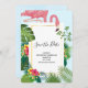 Spara datumkortet med en söt och visuell rosa flamingo. Omgiven av tropiska löv av grönt och röda och gult hibiscus blommor. En kvadratisk guld-övertoning ram i mitten.