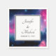 Bröllop-servetter med en vacker abstrakt design i rosa och blått. Vita stjärnor sprinklingade genom hela den här bilden av cosmos. Trippy och coola. En vit kvadrat med svart gräns överst med texten inuti.