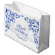 © 2019 Socialite Design Inc. Vackra snurrar och flourerar presentsäck med royal blue och white färg.