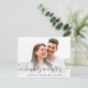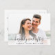 Modern och chic spara datum meddelande vykort. Ditt foto är överlagrat med "lyckligt efter" i ett skript med eleganter med dekorationer och namn och bröllop-datumet gås med ihop av ett hjärta. På baksidan anpassar du datummeddelandet i elegant typografi och lägger till namn i ett namnteckning-liknande skript.