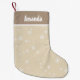 Snyggt och elegant julstrumpor med beige och vit mönster - vit snöflingor på beige bakgrunden. Anpassa lagret med ditt namn. namn är i trendigets vita skript. Perfekt för dina julgåvor till din familj eller dina vänner.