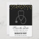 Spara det platta datumkortet med en delad färg-bakgrund med svart och vitt. Faux guld konetti längs övre gräns. Illustrerad med ett grått-stetoskop.