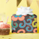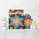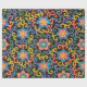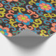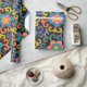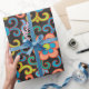 Sömlöst svart textilmönster med stiliserade orange och blå blommor insprängda med neongröna och blå virvlande vinrankemotiv.