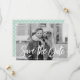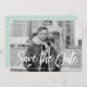 Ange tonen för det kommande bröllop genom att meddela ditt datum med Snyggten Skript spara datumkortet. Datumkortet har ett handskrivet skriptteckensnitt med trendiget mint grönt mönster på baksidan. Anpassa spara datum meddelande med namn, bröllop-datum, stad och förlovning för en design som säkert imponerar!