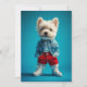 Den här charmerande bilden har en Väster Highland White Terrier som är klädd för att imponera på ett ljusblått denim jacka, en vit t-shirt, vibrant rött kort och vita sensorer. Den här valpen i snyggt är ren och skär och skapar den en fin och hjärtlig syn för mode och hundälskare.