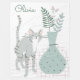 Söt teckning av en grått kattunge som står bredvid ett vackert vas av blommor och växter i jorden, personlig med ditt namn.