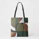 Den här väskan visar upp en harmonisk geometrisk utformning med en lugnande jordad palett, blandning av mjuka gröntar, varm och rena vita accenter. Mönster består av kurvformade och vinkelformade former som hänger samman och skapar ett dynamiskt visuellt flöde. Kontrasten mellan det ekologiska kurvorna och det vassare linjer skapar balans i den totala sammansättningen, vilket påminner om den moderna estetik som finns i mitten av århundradet. De muterade tonerna i påsen gör den både snyggt och underskattad, perfekt för avslappnader eller som ett subtilt tillbehör som kompletterar ett brett spektrum av utseende.