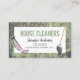 Ett affärskort för rengöring av snyggtar, med bilder av en hovring och mopp, företaget namn, namn av rengörare och deras kontaktuppgifter.