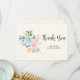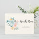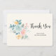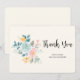 Tack för ett kort med en illustration av sötens vattenfärg. En blombukett med rosa och blåa blommor omgiven av grönt löv och sprit.