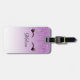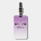 Personligens bagagemärke med trendigets snyggt. Bakgrunden är en lila gradient färg med en bild av att det bildas ett falskt mousserande glitter som droppar uppifrån. Ett par giftigt söta ögonfransar under bilden av glitter.