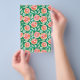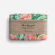 En tvål som omsluter lakan med en design med rosa grapefruktsegment på gröntens bakgrund.