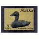 Ett porträtt frimärke från ett mytiskt oberoende Alaska med en tvåstensfärgning av ett Eider Anka. Bakgrunden är gömt av hjärnburk. Detta är en digital återgivning, inte ett egentligt tvåstensobjekt. Den gemensamma Eider, Somateria mollissima, är det största anka som finns i Europa och i Nordamerika (med undantag för Muscovy Anka som endast når Nordamerika i en vild i sydligaste Texas). Eider fördelas över Europas norra kusten, Nordamerika och östra Sibirien. Den föder i Arktis och vissa nordliga tempererade regioner, men vintrarna ligger något längre söderut i tempererade områden, när den kan bilda stora flockar på kustnära vatten. Den kan flyga med hastigheter upp till 70 mph (113 km). Eider kännetecknas av sin skrymliga form och stora, kilformade räkning. Mannen är otvetydig, med sitt svarta och vita tumage och sin grönt. Hondjuret är en brun fågel, men kan fortfarande lätt skiljas från alla anka, utom andra ejderarter, på grundval av storlek form och huvudform. Det här anka-uppropet är en trevlig "ah-oo". Arten är ofta lätt åtkomlig. Drake i Europa, östra Nordamerika och Asien/westerna Nordamerika tävling kan särskiljas genom mindre skillnader när det gäller börd och notering i färg. Denna art föder upp kräftdjur och blötdjur, och musslor är ett prioriterat livsmedel. Eider kommer att äta musslor genom att svälja dem hela; snäckorna krossas sedan i magarna och utsöndras. När man äter en krabba tar Eider bort hela klo och ben och äter sedan kroppen i ett liknande mode. Det är rikligt, med en befolkning på 1,5-2 miljoner fåglar i både Nordamerika och Europa, och även ett stort men okänt antal i östra Sibirien. En särskilt berömd koloni av eiders bor på Färöarna i Northumberland, England. Fåglarna var subjekt i en av de första fågelskyddslagarna någonsin som Saint Cuthbert inrättade år 676. Cirka 1 000 par bor fortfarande där varje år. Eftersom St. Cuthbert är Nordlandets skyddshelgon var det naturligt att eider valdes som landets emblemfågel. Fåglarna kallas fortfarande ofta Cuddys anka i området, eftersom "Cuddy" är den välkända formen av "Cuthbert". Den gemensamma Eider är en av de arter som omfattas av avtalet om bevarande av flyttande sjöfåglar i Afrika och Eurasien (AEWA). Eiders är kolonialuppfödare. De bor på kustöar i kolonier på mindre än 100 storleka upp till 10 000-15 000 individer. Kvinnliga ejdrar uppvisar ofta en hög grad av naturfilopati, där de återvänder till sin ras på samma ö där de kläcktes. Detta kan leda till en hög grad av släktskap mellan individer som bor på samma ö, liksom till utvecklingen av familjebaserade strukturer för hondjur i social. Detta samband har troligtvis spelat en roll för utvecklingen av kooperativa avelsbeteenden bland eiders. Exempel på sådana beteenden är att värpa ägg i hägnen på närstående individer och att ge daghem, där kvinnliga djurskötare lagrar och arbetet med att föda upp anklingar. Erikens bo är byggt nära havet och är fodrad med den berömda härden, plockad från kvinnans bröst. Denna mjuka och varma foder har sedan länge skördats för att fylla kuddar och kjolar, men under senare år har den till stor del ersatts av domestic från lantbruksgäss och syntetiska alternativ. Även om nedgrävda kuddar eller kjolar nu är sällsynt fortsätter nedskärningen av skörden och är hållbar, vilket kan göras efter det att anklingarna lämnar boet utan att fåglarna skadas.