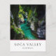 Foto vykort av Tolmin-ravinen med mossiga branta klippor och magnifik blå vatten i Soca-dalen, nära Kobarid i Slovenien med en vit ruta med texten 'Soča-dalen, Slovenien' och linjer i vitt, blått och rött, färgerna på den slovenska flaggan.