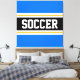 Den här färgstarka sportetiska designen har fetstilt SOCCER-text inuti ett stort svart vågrät i rand med vita och gyllene tävlor i gult mot ljusblå yttre ränder. Texten kan vara personlig.