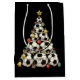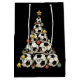 A festive Christmas tree made entirely of stacked soccer balls, decorated with ornaments, bells, gift boxes, and colorful string lights, topped with a bright star.
