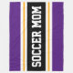 Den här sportetiska, atletiska designen innehåller fetstilt SOCCER MAMMA-text i ett markerat svart rand med dubbla vit och gult tävla ränder mot royalets yttre ränder för lila. Texten i den här designen kan vara personlig.
