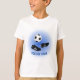 A fun t-shirt with a soccer theme front and back. The design has soccer boots and a ball on a soft blue background on the front, with a further soccer ball on the back. You can customize the caption on the front of the t-shirt which reads "SOCCER STAR" in blue text. Add your preferred name or other text on the back too.