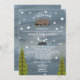 En babydusch med e-postinbjudan med en illustration av en björn i baby på träd gren omgiven av stjärnor med originalet dikt. Bergsillustration och träd i grund. Anpassa texten. Bakgrunden är mörk blått vattenfärg inspirerad.