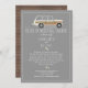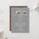 Ett social som avstånd karantäntema kör genom bröllop möhippa med en SUV-träpanel som dekoreras med tennburkar, blommor och grönska över gråttets bakgrund. Motsatt sida är träplankens utformning.