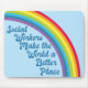 Arbetstagarna i social gör världen till ett bättre ställe. Motiverande social-arbetserbjudande med ett vackert inspirerande citat under en söt regnbåge i blå himmel. Söt social finns.
