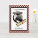 Ett sött hälsningskort som har en svart studentmössa på en svart och vit glob med ett sammanfogat examensbevis bredvid det. Ett vitt och rött markerat gräns omger bilden. Perfekt för högskoleexamen eller högskoleexamen. All text inuti och ut är anpassade.