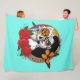 En sockerskalle sitter bakom en kvinna som bär day of the dead-sockelskalle och som alla dras i art nouveau stil.