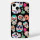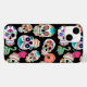 Ljusa och färgstarka bilder av sockerdöskallar gör en roligt mönster på detta unika telefonfodral. Det finns flera olika bilder i skallen, alla individer i olika färg och placerade på en dramatisk svart bakgrund.