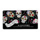 En färglös fartygsetikett för "Day of the dead"-festligheter med en mängd dekorativa döskallar av socker med blommor och snurrande accenter på en svart bakgrund (tillval). Den vita banderollen, som innehåller texten "Feliz Dia de los Muertos", är valfri och kan strykas om det är önskvärt. Sök i ID725 om du vill se andra alternativ och produkter för färg med roligten mönster.