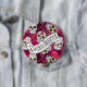 En färgstark knappdesign för högtider i Day of the dead, med en mängd dekorativa döskallar av socker med blommor och snurrande accenter på en texturerad ro-röd bakgrund. Om du föredrar en vanlig döskallar mönster kan texten "Dia de los Muertos" i lagrar utgå. Sök i ID725 om du vill se andra alternativ och produkter för färg med roligten mönster.