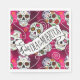 En färgstark papper napkin-design för högtider i Day of the dead, med en mängd dekorativa döskallar av socker med blommor och virvelaccenter på en texturerad ro-röd bakgrund. Om så önskas kan den angivna banderollen "Feliz Dia de los Muertos" och texten lagrar raderas för att använda detta mönster för andra tillfälle. Sök i ID725 om du vill se andra alternativ och produkter för färg med roligten mönster.