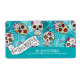 En färglös fartygsetikett för "Day of the dead"-festligheter med en mängd dekorativa sockerprodukter med blommor och snurrande döskallar på en texturkosa blå bakgrund. Den vita banderollen, som innehåller texten "Dia de los Muertos", är valfri och kan tas bort om du föredrar det. Sök i ID725 om du vill se andra alternativ och produkter för färg med roligten mönster.