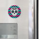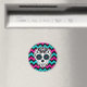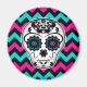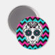 En sockerskalle med svart, shock rosa och turkos accents på en chevron mönster-bakgrund i matchande färg. Här på en magnet.
