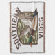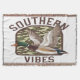 Denna vita filt har en detaljerad illustration av en gräsänder anka under flygning, som ställs mot en kamouflage bakgrund inom ett bågat ram. Texten "SOUTHERN" ritas ovanför bilden och "VIBES" placeras nedan i ett enkelt, fetstilt teckensnitt. Utformningen tyder på en uppskattning av vilt och en sydlig livsstil.