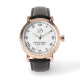 Sofistikerad manar-klocka med anpassningsbar monogram och läderband finare. Anpassa med anpassningsbar. Elegant roman numerär klocka med brunt eller svart läderband. Skapa din egen unika finare-klocka för honom. Klasstid biet med latinska siffror, namn, datum och anpassningsbar, färg. Vackert julklapp för manar gifta sig, pensionering eller annat tillfälle. Gör din egen chic till en tidspunkt för vänner, familj, medarbetare, brudar etc. Också underbar som lyxdagspresent eller julklapp till morpa, pappa, sjöman, båtkapten, medarbetare, kollega, kollega, företag chef, groom, Helgdag, anställd, buss, morbror, affärspartner, lärare osv. Luxypresentidéer för honom. Snyggtens skripttypografimall. Lägg till din egen namn och datum på uppringningen.