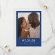 Denna bröllops-karta för att spara datumet har en modern och elegant design med en ren, minimalistisk layout. De två översta tredjedelarna visar ett fotografi av ett par, inramat av en marinblå kant som kontrasterar vackert mot de ljusare tonerna i bilden. Under fotot är den nedre tredjedelen tillägnad text mot samma marina bakgrund, med en enkel serif-typsnitt för en sofistikerad look. Den övergripande estetiken är raffinerad och samtida, perfekt för att sätta tonen för en kommande fest.