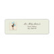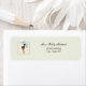 En babyduschadressetikett med ljusblå bakgrund och brun text. Illustration till lämnat om en brun stork som bär en blå bunt inuti en ruta med blå båge överst. Leta efter matchande inbjudningar och klistermärken på Jill's Paperie.