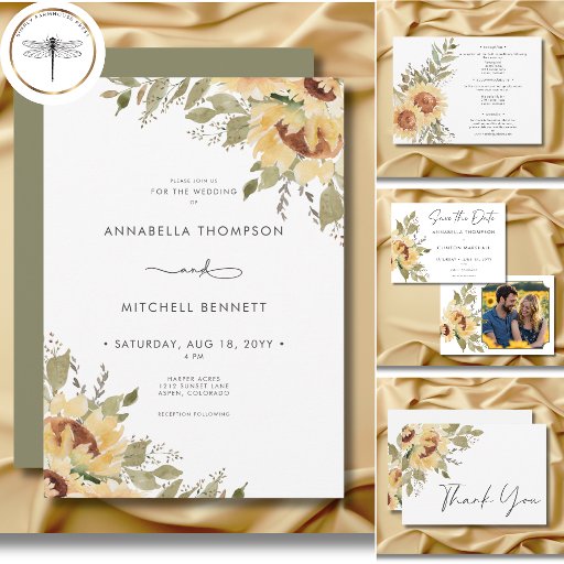 Gratulera till kärlek med vår boho rustic bröllop-tack, designad för att ange perfektens tonläge för din speciella dag. Den här utformningen blandar naturlig charm med modern elegans och har klara vattenfärgssolblommor i rikens gyllene gult, jordbrun och mjuk grönt, placerade i motstående hörn. Teckensnittet på ren contemporary ger en ny beröring och skapar det perfekt för par som kärlek utan skönhet och rustik romantik. Solrosgrafik skapat av Verya Studios. Skapat av Farmhouse Press.