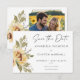 Fira kärlek med vårt boho rustic bröllop spara datum-kort, designat för att ange perfektens tonläge för din speciella dag. Den här utformningen blandar naturlig charm med modern elegans och har klara vattenfärgssolblommor i rikens gyllene gult, jordbrun och mjuk grönt, placerade i motstående hörn. Teckensnittet på ren contemporary ger en ny beröring och skapar det perfekt för par som kärlek utan skönhet och rustik romantik. Solrosgrafik skapat av Verya Studios. Skapat av Farmhouse Press.