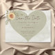 Backa den fritt sinnade karmen av boho elegance med vårt fantastiska bröllop spara datum-kort. Med en vattenfärg i grönten för lugnande medel tvättar bakgrunden, grönten är en mörkare sage-hjärna med kluster av mjuk gult, brun och sage grönt solblommor. Den moderna typsnittsrubriken och den rena, avslappnad brödtexten ger en contemporary, perfekt balans mellan stil och lätthet. Den här designen fångar på ett vackert sätt kärnan i din kärlek-historia och bjuder in dina gäster att fira i en naturskön och avslappnad sofistikering. Solrosgrafik skapat av Verya Studios. Skapat av Farmhouse Press.